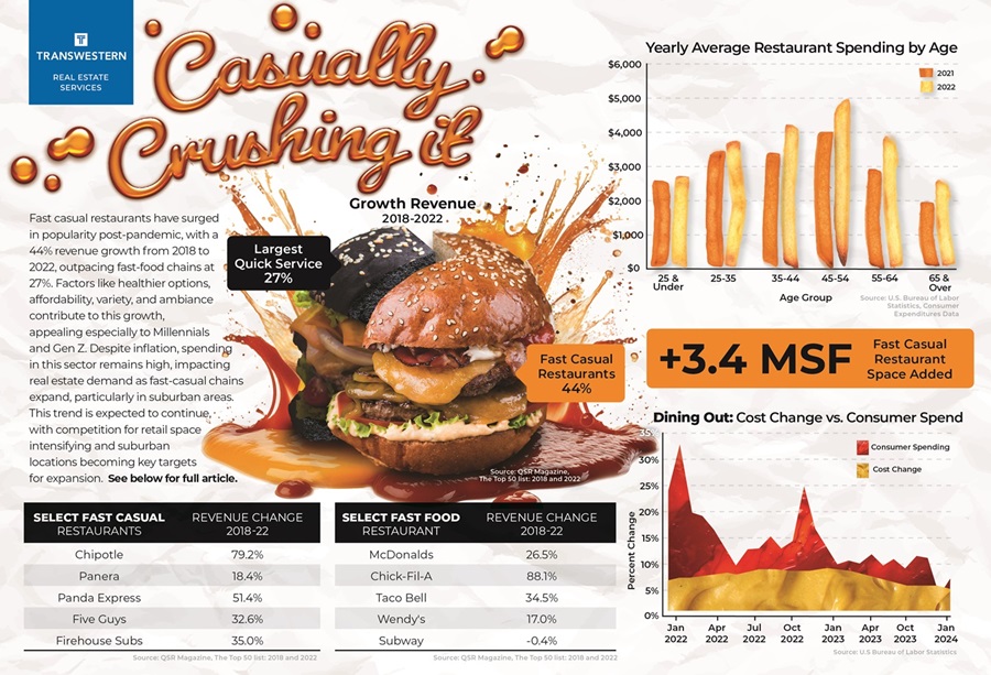 In response, the competition for retail space is expected to intensify. Despite record-low availability rates, fast casual chains will persist in opening new locations. This expansion is justified by the steady increase in revenues that can support higher rental rates. We expect suburban areas to witness outsized demand as fast casual restaurants strategically position themselves to cater to the needs of today’s work-from-home and hybrid employees.